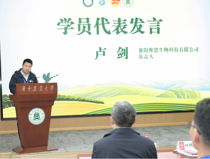 来自襄阳维恩生物科技有限公司的卢剑作为学员代表发言。他结合自身从事现代种业的实践经历,表达了对本次学习的期待与信心。他代表全体学员郑重承诺:大家将以“归零”心态潜心学习,积极交流互鉴,勇担“头雁”使命,务求将所学所获转化为扎根乡村的实际行动,引领乡亲们共同迈向富裕,为乡村振兴贡献力量。