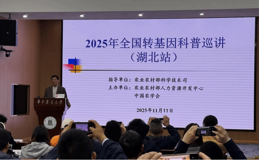 初冬暖阳沐荆楚,科普甘霖润心田。11月11日,在农业农村部科学技术司指导下,由农业农村部人力资源开发中心与中国农学会联合主办的“全国转基因科普巡讲(湖北站)”活动在华中农业大学成功举办。本次活动特邀华中农业大学郑用琏教授,以《转基因技术与现代农业》为主题,为来自湖北各地的“头雁”学员们带来了一场精彩纷呈的科普盛宴。
