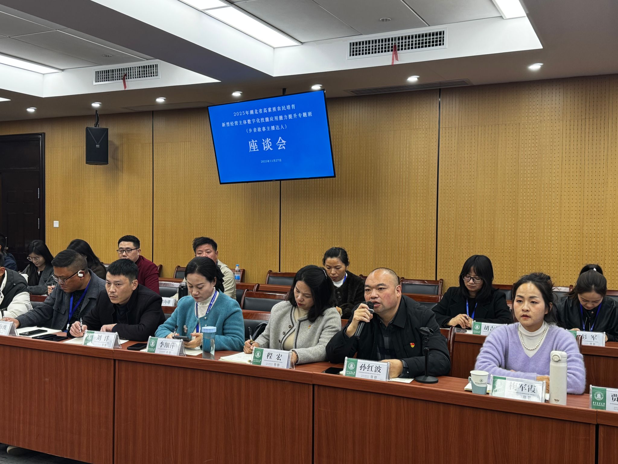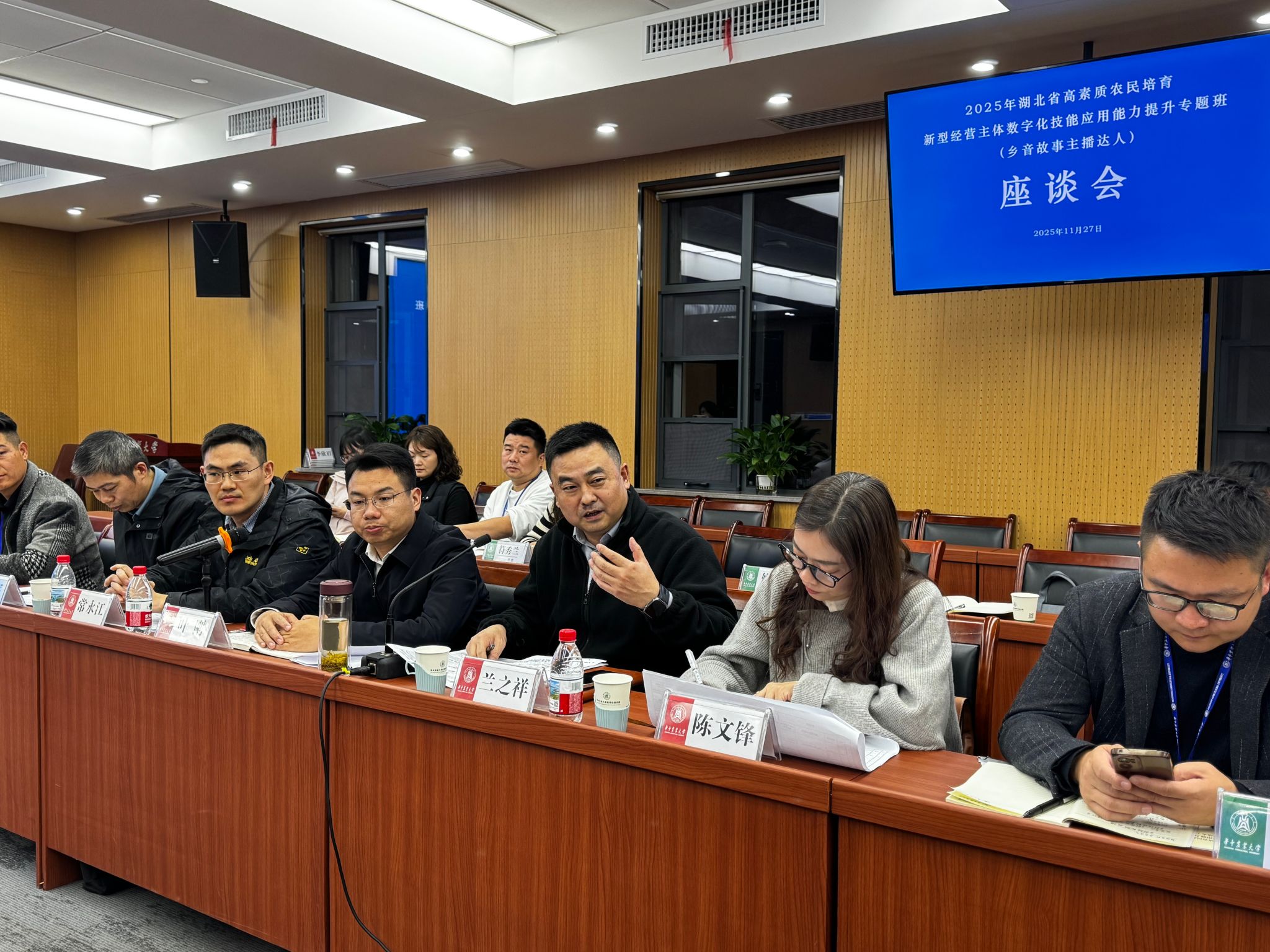 近日,来自湖北省各地的村“两委”干部、新农人代表齐聚华中农业大学,参加2025年湖北省高素质农民培育新型经营主体数字化技能应用能力提升专题班(乡音故事主播达人)的座谈交流会。与会学员与省农业农村厅、华中农业大学的领导老师们围坐一堂,分享用手机屏幕服务乡亲的甘苦,共话数字赋能乡村振兴的实践与未来。
