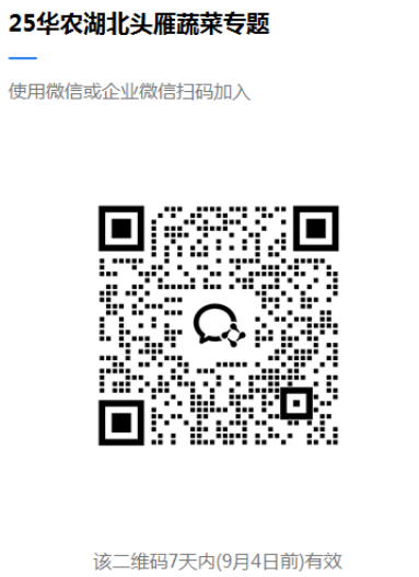 大家好!湖北省2025年乡村产业振兴带头人培育“头雁”项目(蔬菜专题)即将开班,培训时间为2025年9月6日-9月27日。为保证信息共通,内容共享,如您确认参训请您先截屏下方二维码,再打开微信扫描二维码加入本次培训班级群,以便及时获得最新通知。