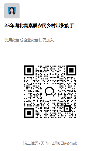 大家好!2025年省级高素质农民培育计划--乡村带货能手专题班(一班)即将开班,培训时间为2025年12月10日-12月20日。为保证信息互通,内容共享,如您确认参训请您先截屏下方二维码,再打开微信扫描二维码加入本次培训班级群,以便及时获得最新通知。