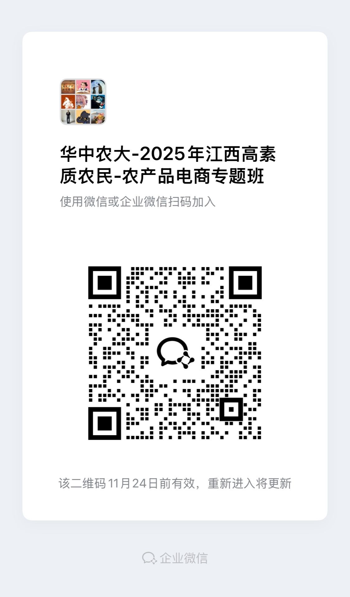 为保证信息互通,内容共享,如您确认参训。请您先截屏下方二维码,再打开微信扫描二维码加入本次培训班级群,以便及时获得最新通知。